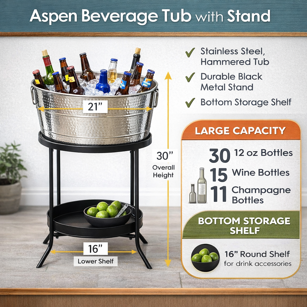 Material:heavy hammered stainless steel, iron Color: stainless steel Size: 21"L x 14.5"W x 9"H / 28"H with stand Capacity: 25QT | 24 to 30 bottles twelve-ounce bottles